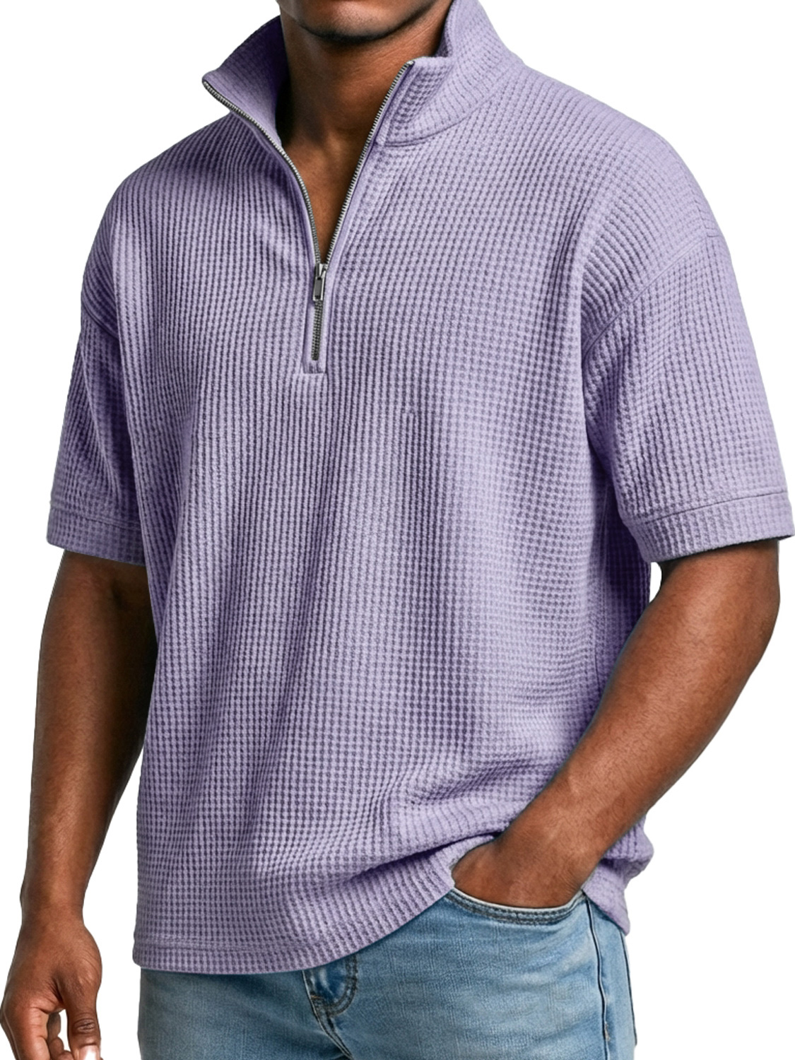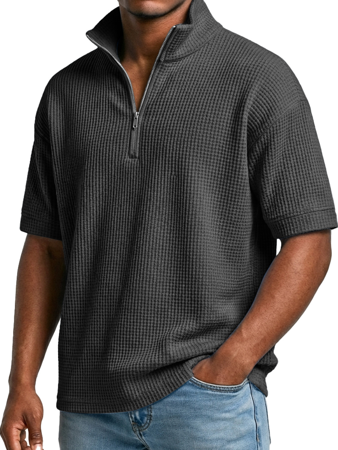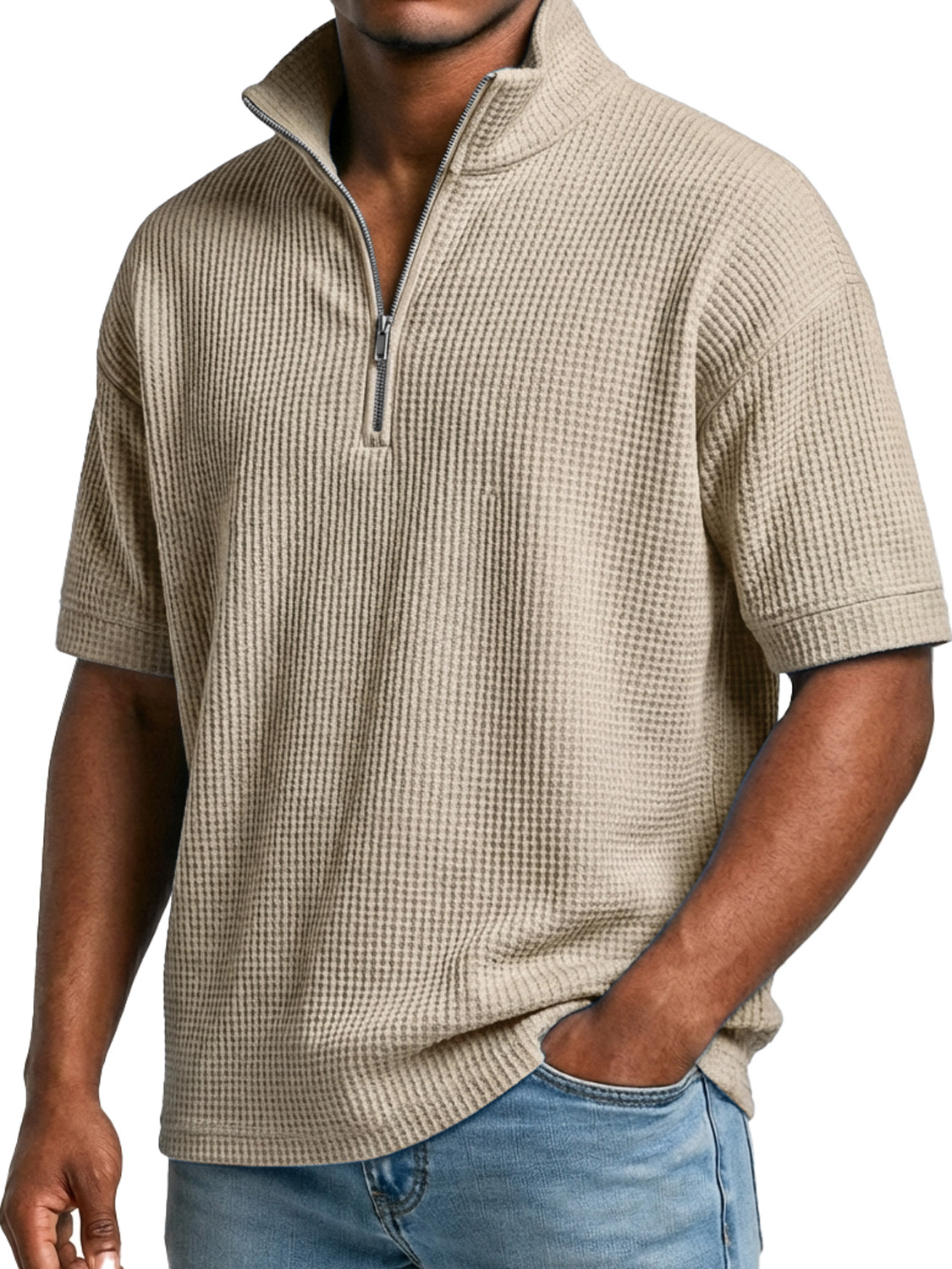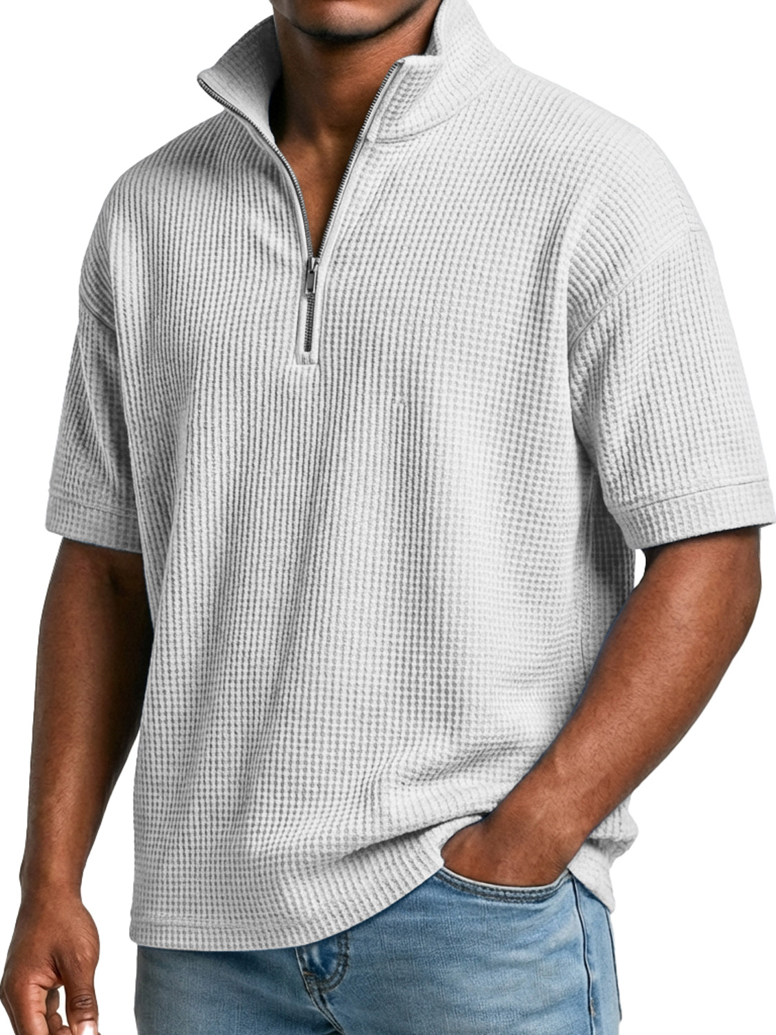 Men's Waffle-knit Simple Stand-collar Zip-up Casual Short-sleeved T-shir