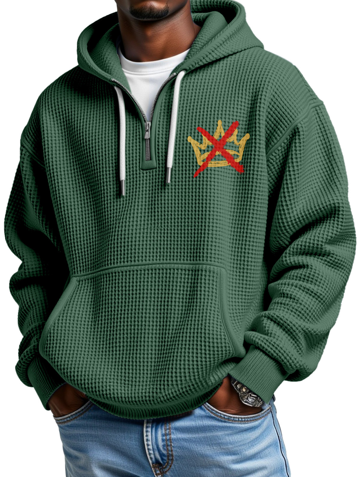 No King Waffle Texture Zipper Hooded Long-sleeved Sweatshirt